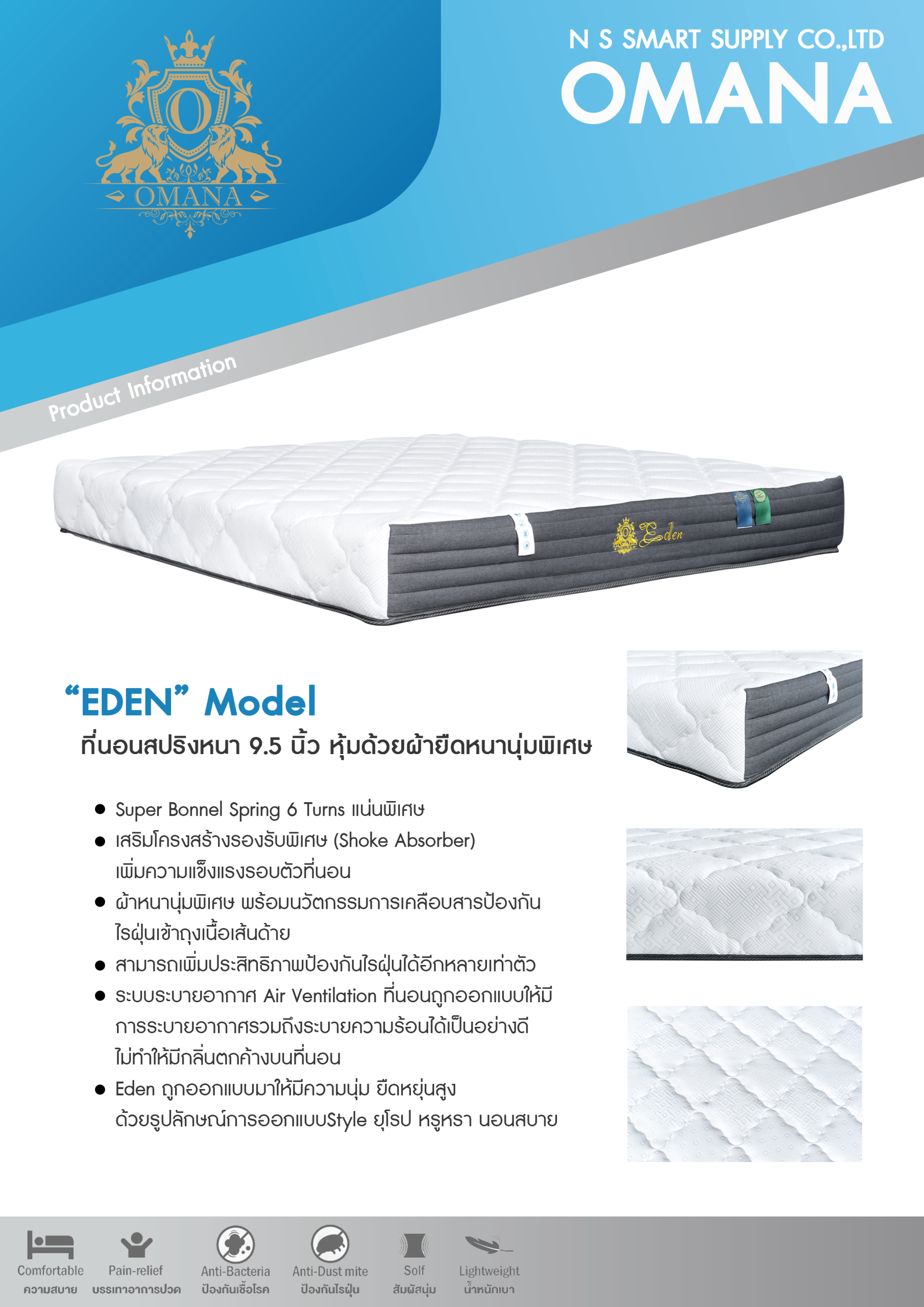 - Eden ถูกออกแบบมาให้มีความนุ่ม ยืดหยุ่นสูง ด้วยรูปลักษณ์การออกแบบStyle ยุโรป หรูหรา นอนสบาย