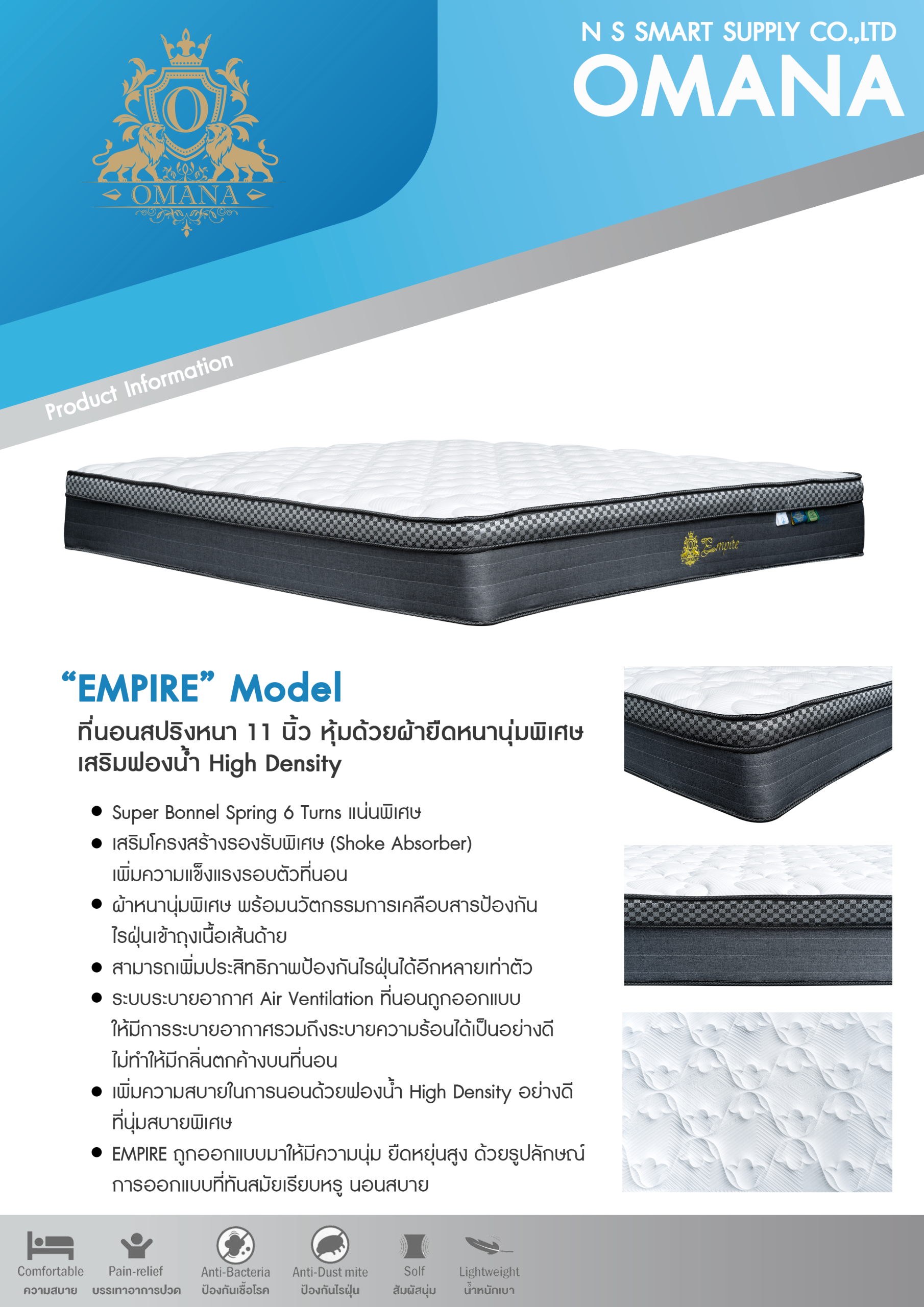 - EMPIRE ถูกออกแบบมาให้มีความนุ่ม ยืดหยุ่นสูง ด้วยรูปลักษณ์การออกแบบที่ทันสมัยเรียบหรู นอนสบาย
