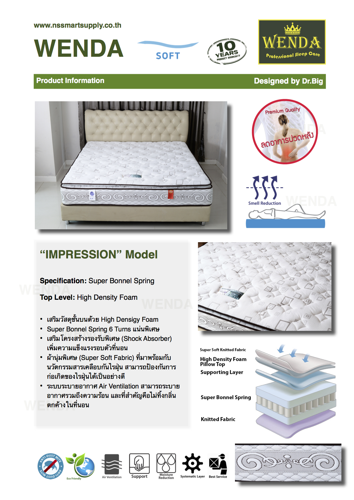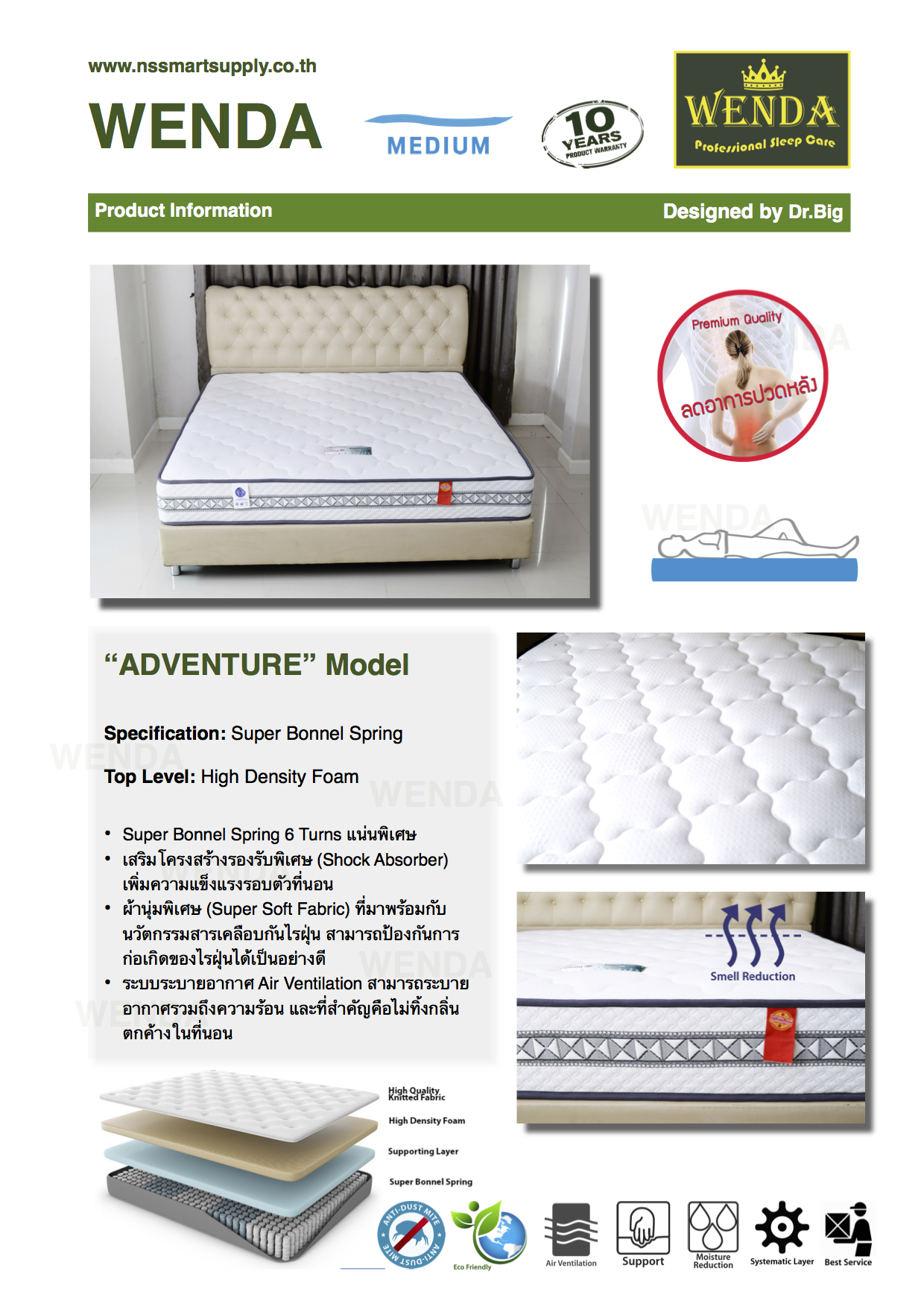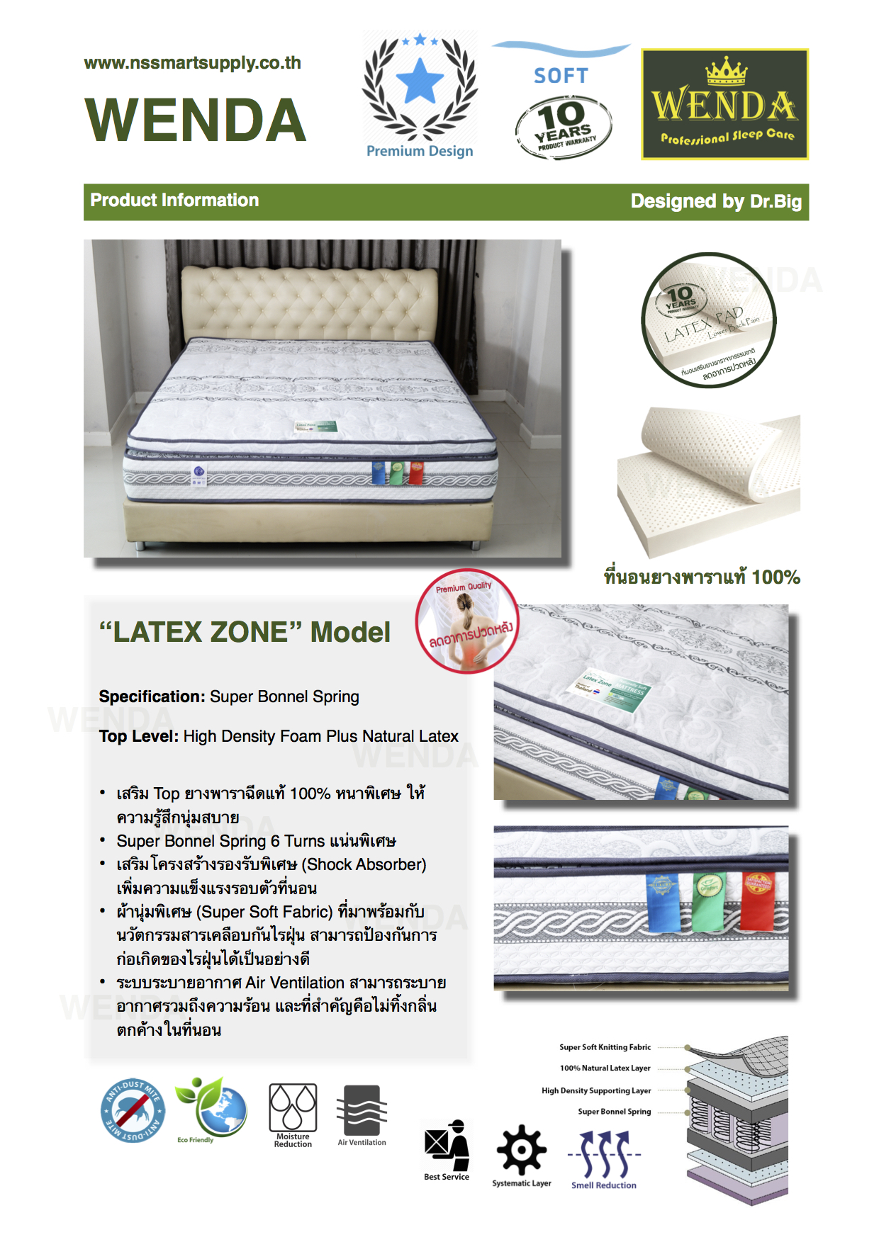 - เสริมโครงสร้างรองรับพิเศษ (Shock Absorber)เพิ่มความแข็งแรงรอบตัวที่นอน